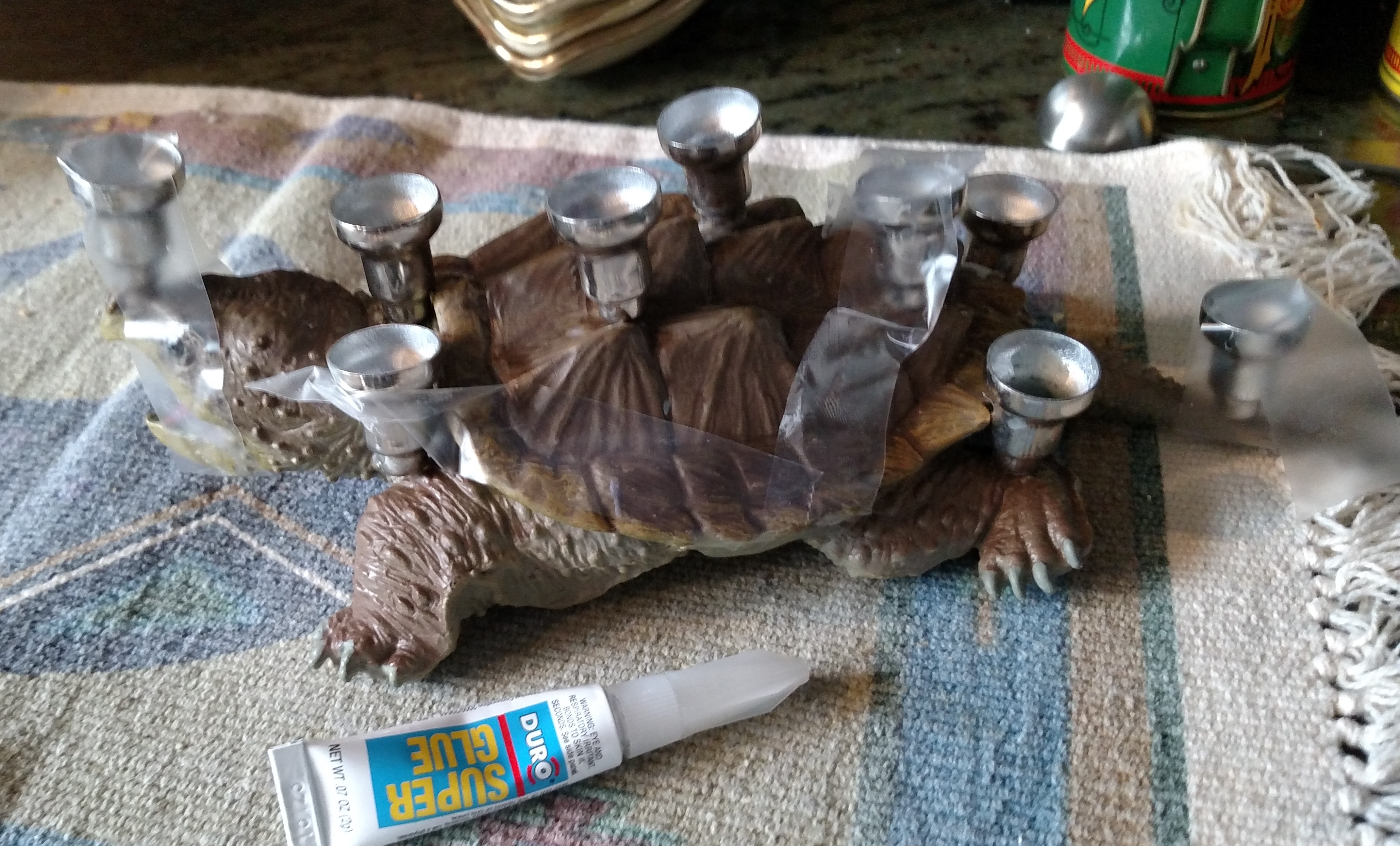 I had moderate success with Super Glue, but in the end I might have resorted to duct tape on a few of the most stubborn candle holders, but brown duct tape with a wood grain at least. While technically the candles are supposed to be in a straight line, sometimes you have to make do with what you have, and when what you have is a bumpy-backed snapping turtle, you have to be a little flexible.
