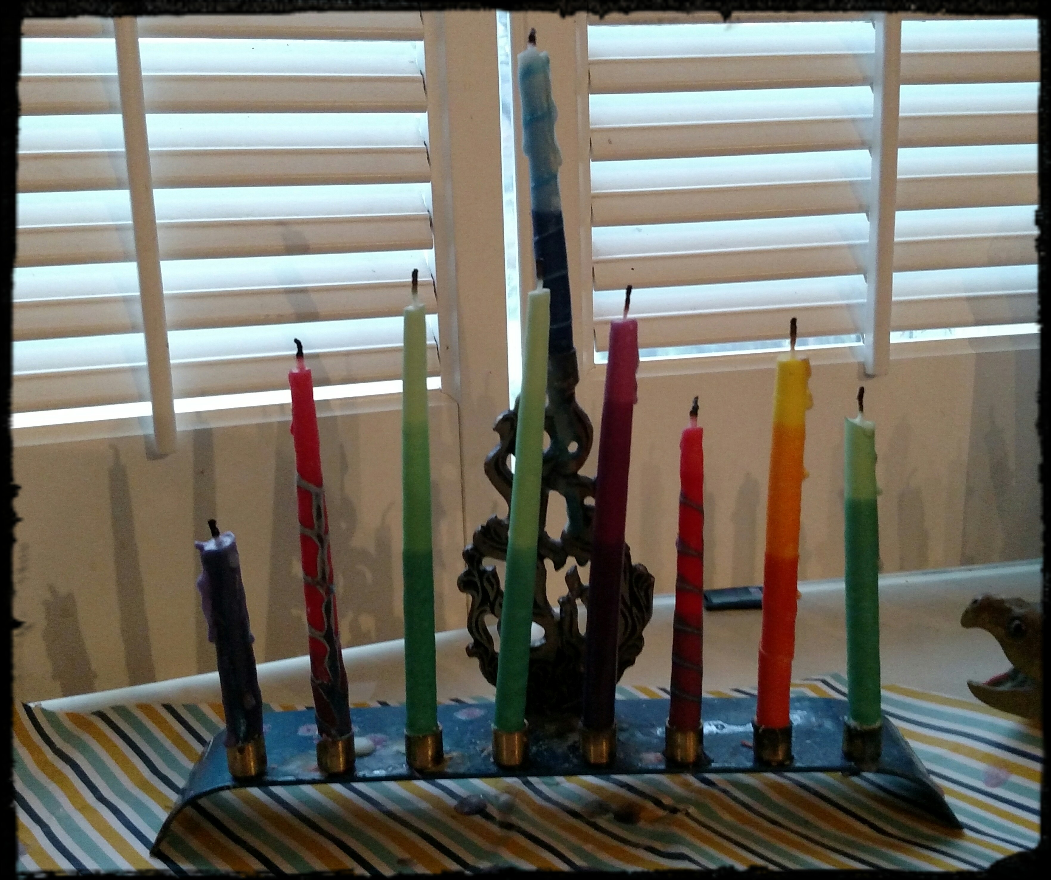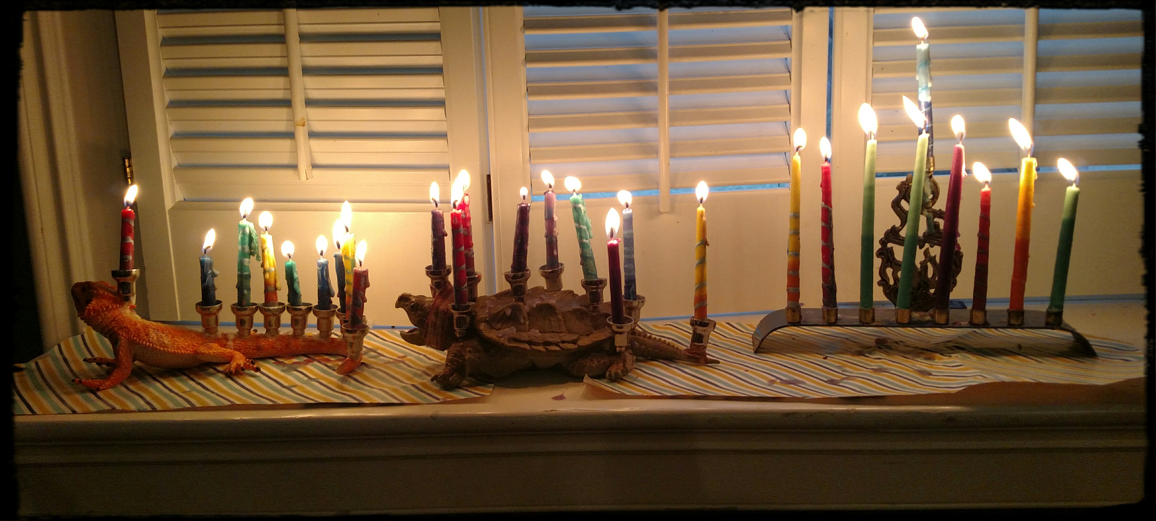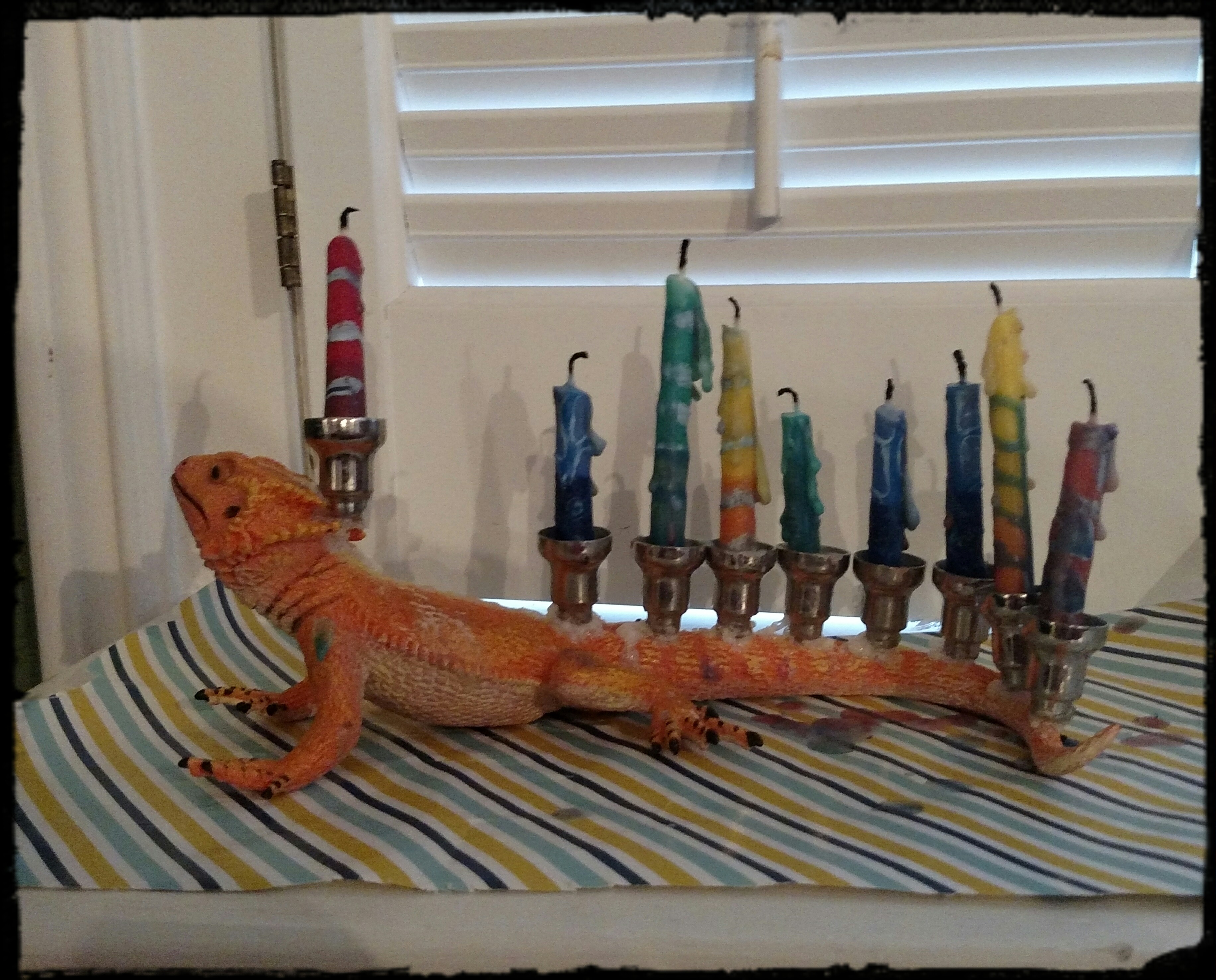 Our Chanukah miracle this year wasn’t that we had enough oil to burn for eight nights, but rather that our menorahs stayed glued together for eight nights. With my eldest going into high school next year, I don’t know how many more years of lizard menorahs we have. I’m grateful we got this one, even if it required a little duct tape and determination.