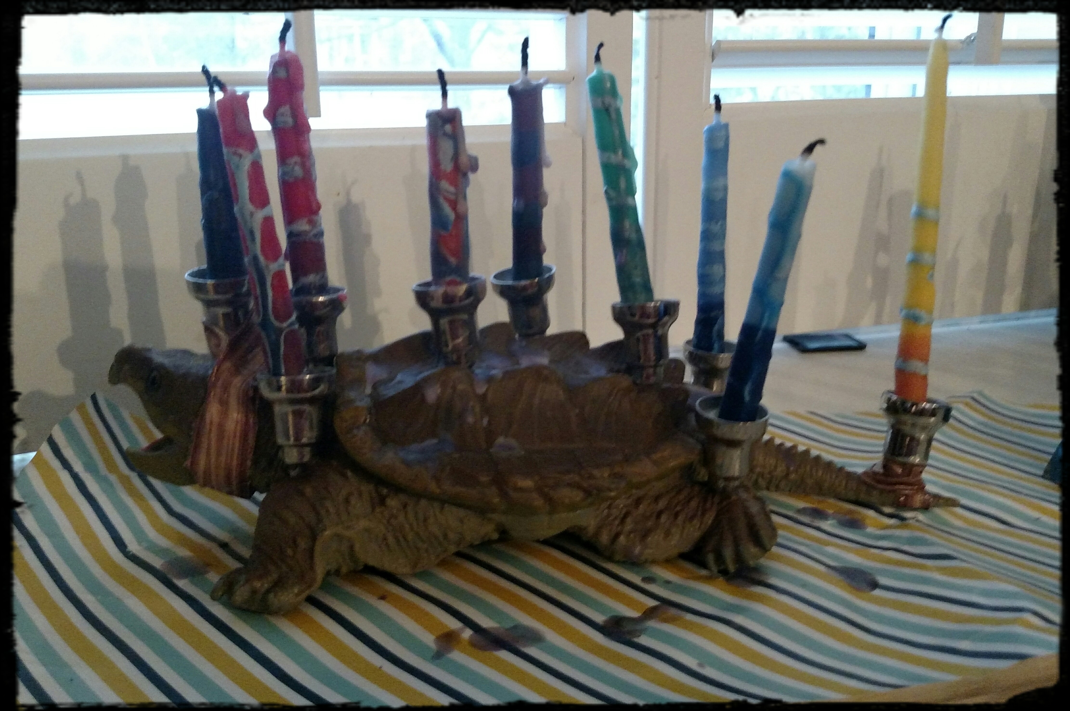 However, life has always been harder for my youngest, and menroah making was no exception. Gorilla Glue did not work for his snapping turtle menorah.