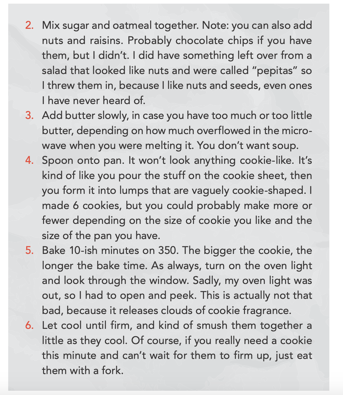 6. Let cool until firm, and kind of smush them together a little as they cool. Of course, if you really need a cookie this minute and can’t wait for them to firm up, just eat them with a fork.