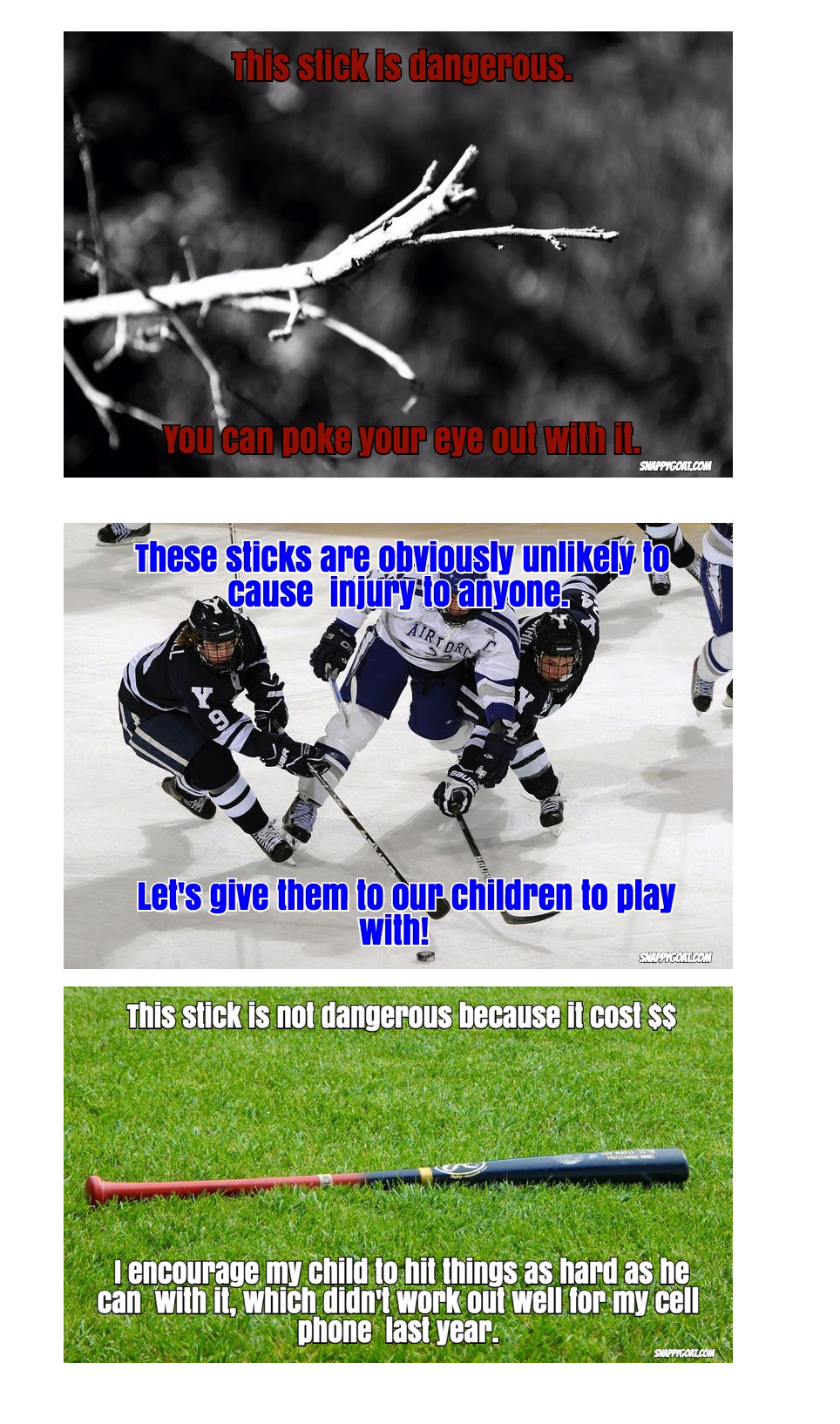 Obviously bad things can happen. I’m not saying I’m going to drop my two sons onto an island and let them battle it out Lord of the Flies style. But I seem to be just fine about sending him on an ice rink to play hockey, one of the 10 most dangerous sports for kids. Why am I all freaked out about letting him roam around the woods, but actively encourage him to play a sport that I know will likely result is loss of teeth, if not worse? Apparently I’m only over-protective when the activity is free and requires minimal effort from me. For some reason, emptying my bank account and gas tank to watch my kid strap metal blades to his feet and try to hit things with a long stick is perfectly rational. Letting him find his own stick for free while I sit on the porch (approximately the same distance from my child as I am in the stands when he is on the ice) seems reckless. Anything could happen, because free sticks are dangerous.